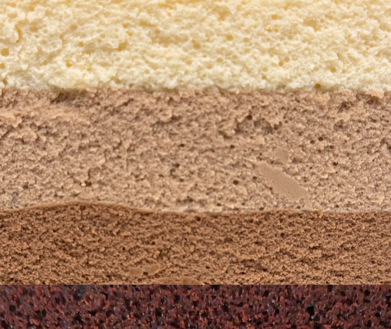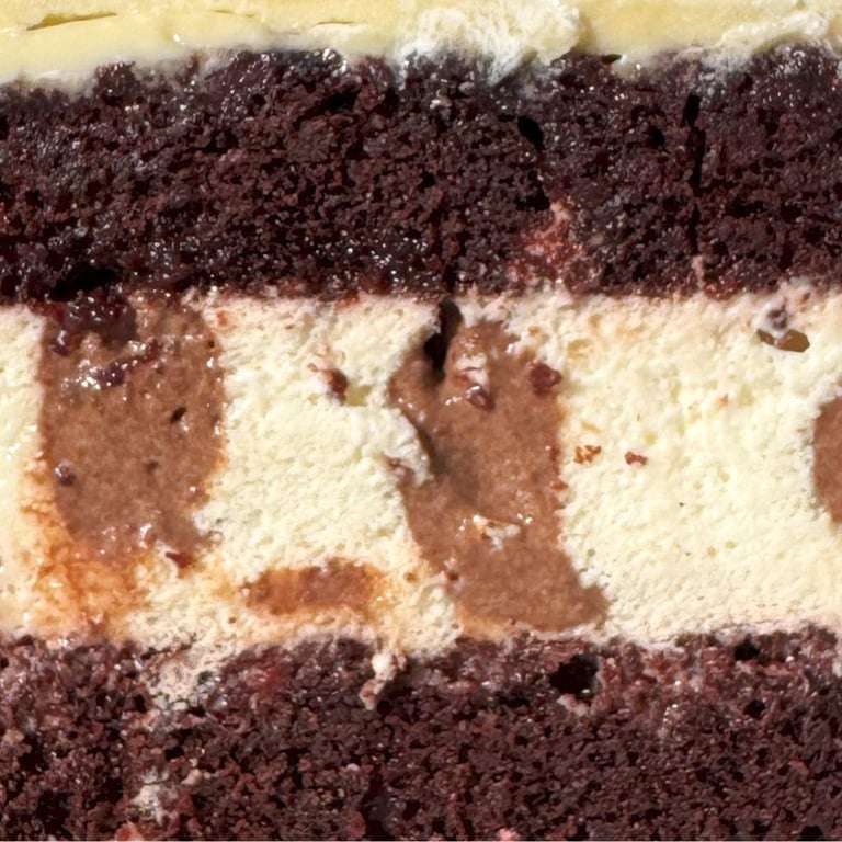 Tri vrstvy delikátnych čokoládových moussov – mliečna, horká a biela čokoláda – na baze jemného krému Anglez a tenkom čokoládovom korpuse. Každá vrstva sa hladko rozplýva na jazyku a spoločne vytvára harmonickú, zamatovú textúru, ktorá vás doslova očarí.