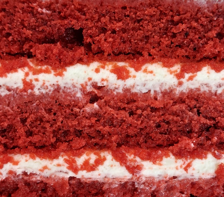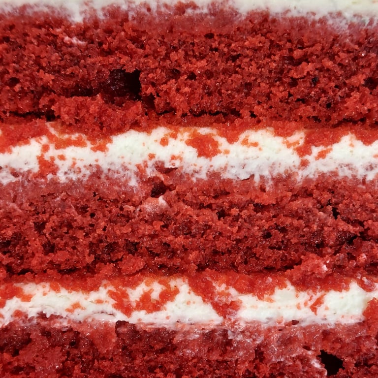 Piškóta červený zamat (múka, kakao, vajcia, cukor, mlieko, olej, maslo 82%, červené potravinárske farbivo), mascarpone krém (mascarpone, smotana na šľahanie 33%, práškový cukor, vanilková pasta), ovocné konfi (jahoda/malina/višňa/lesné ovocie, cukor, kukuričný škrob/pektín Nh.
