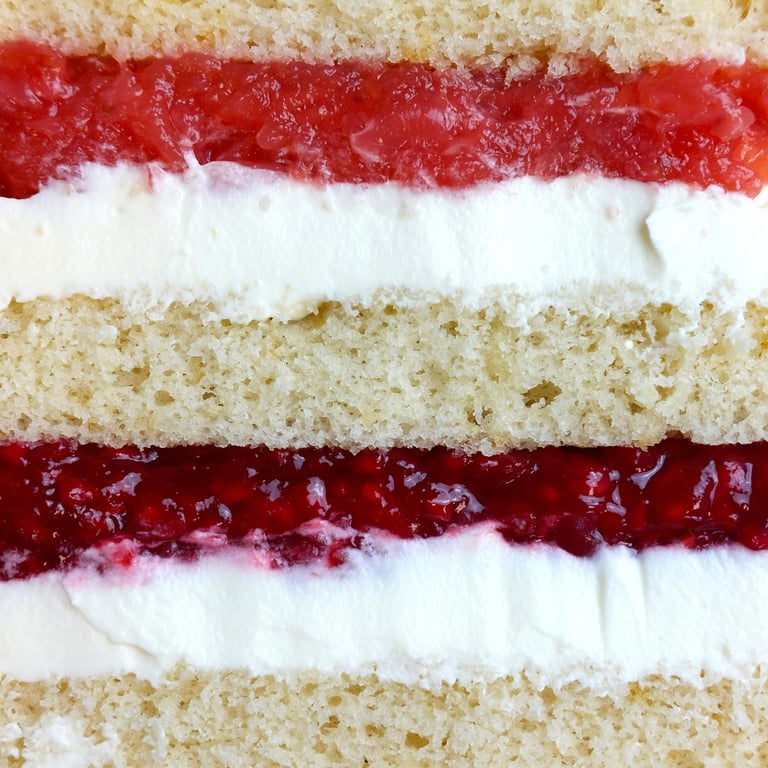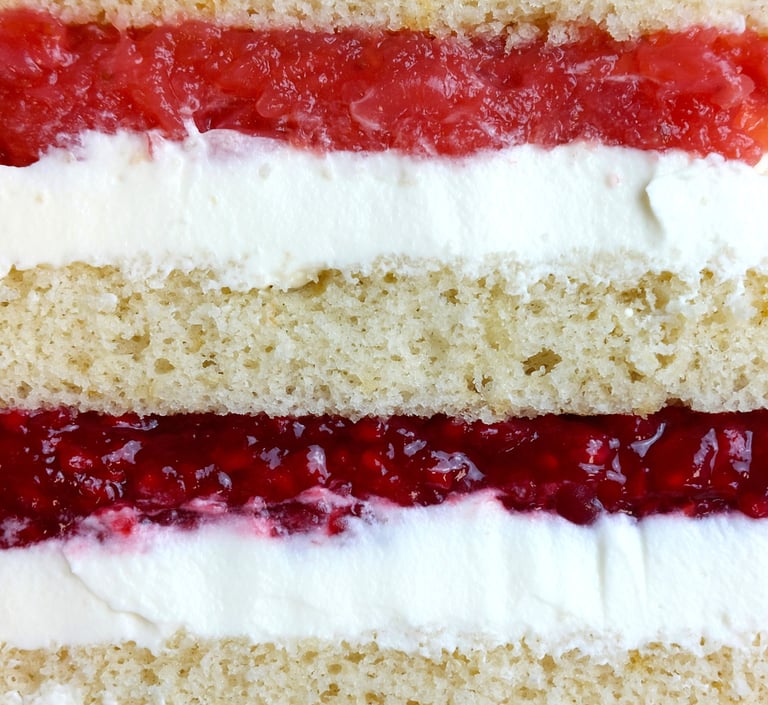 Srdcom torty je malinové alebo jahodové konfi – svieže a výrazné, s jemne kyslastým podtónom, ktorý dokonale vyvažuje sladkosť piškót a krému.