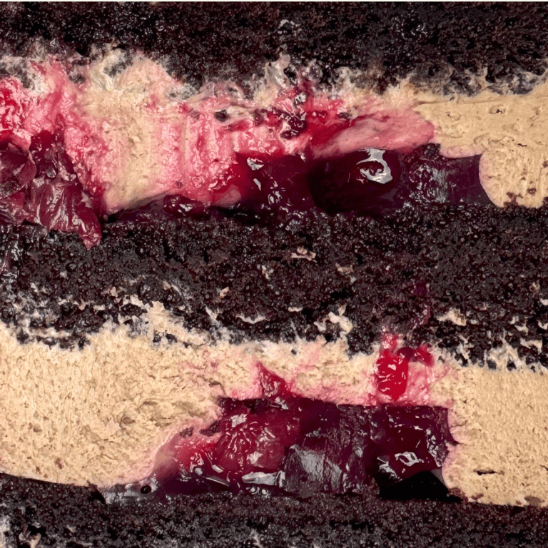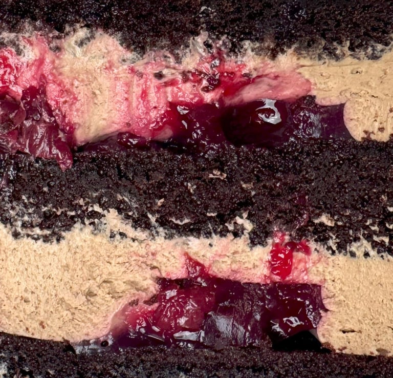 Ideálna kombinácia jemného čokoládového piškótu a nadýchaného čokoládového krému, ktorá rozbúši vaše srdce. Višňové konfi dodáva sladkú a jemne kyslú chuť, ktorá skvelo dopĺňa bohatý čokoládový základ.