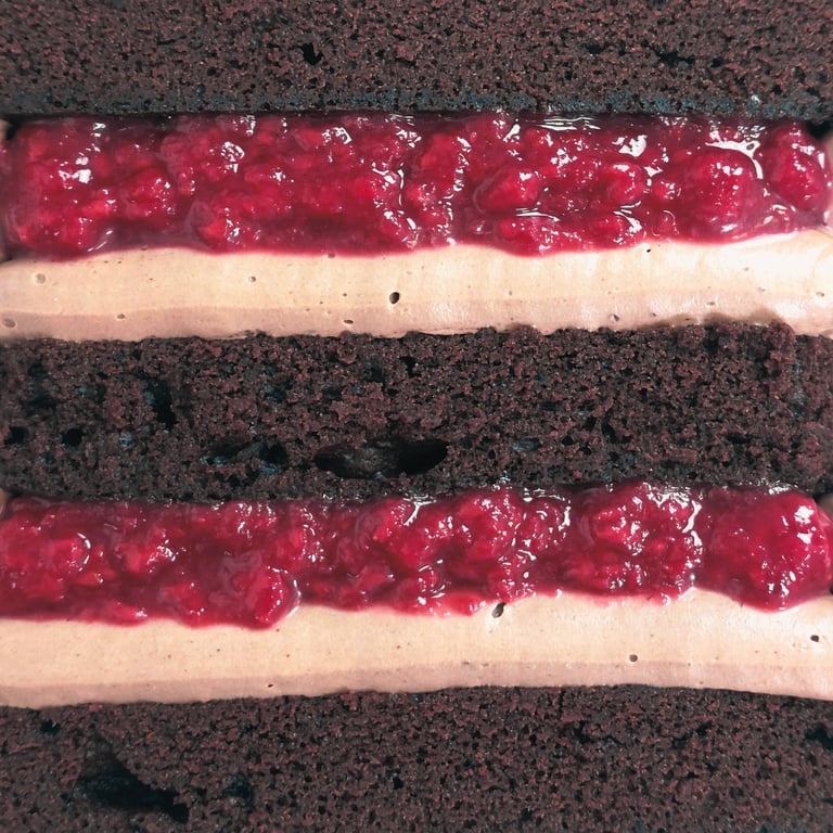 Ideálna kombinácia jemného čokoládového piškótu a nadýchaného čokoládového krému, ktorá rozbúši vaše srdce. Malinové konfi dodáva sladkú a sviežu kyslosť, ktorá dokonale vyvažuje čokoládový základ.