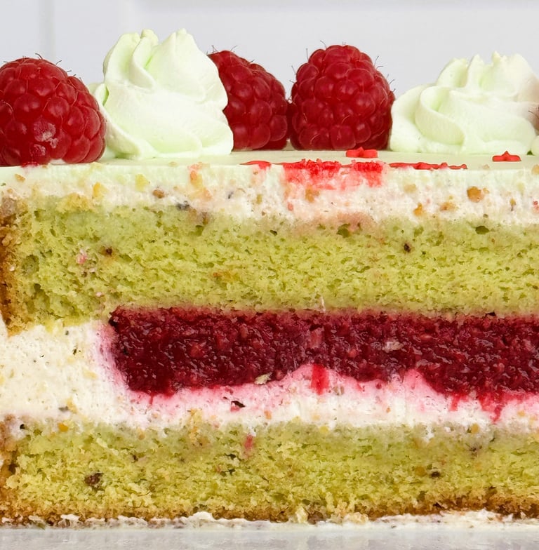 Táto torta je stvorená pre milovníkov nezvyčajných a rafinovaných chutí. Základom je vláčna pistáciová piškóta, ktorá v sebe nesie jemnú orieškovú arómu. Dopĺňa ju bohatý pistáciový krém s krémovou textúrou, pripravený z kvalitnej pistáciovej pasty. Sviežosť a ľahkú kyslosť do tejto harmonickej kompozície vnáša malinové konfi, ktoré tortu nielen chuťovo vyvažuje, ale aj oživuje.